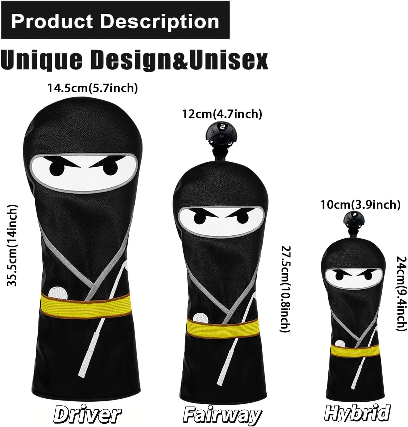 This golf club case features a unique black and white look, including one wood, fairway wood, and hybrid headcovers for precise core coverage and one-stop protection. Waterproof and abrasion-resistant material effectively resists bumps and scratches and rain in the bag to prolong club life. Whether it's for daily practice, playing off the field or as a gift for a golfer, this Ninja Head Cover will make a great eye-catcher in your bag with reliable protection